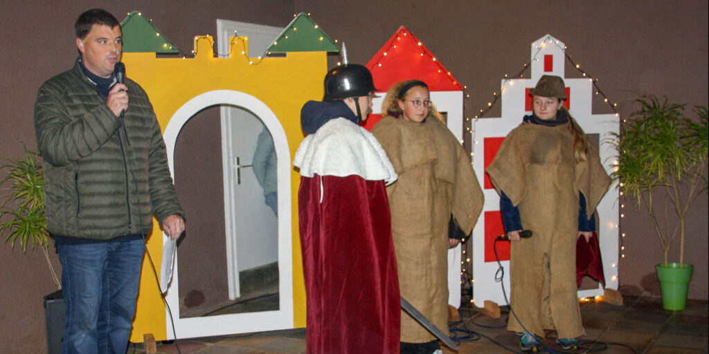 Hier war schon in den Stunden vorher eine kleine Kulisse aufgebaut worden, in der ein Bettler auf der Straße vor einigen Häusern saß, wo anschließen das Stück vom heiligen Martin aufgeführt wurde. Mit großem Interesse verfolgten die dicht bei einander stehenden Kinder mit ihren bunten Laternen in den Händen das Schauspiel vom mitleidigen Mann und dem reich beschenkten, frierenden Bettler.