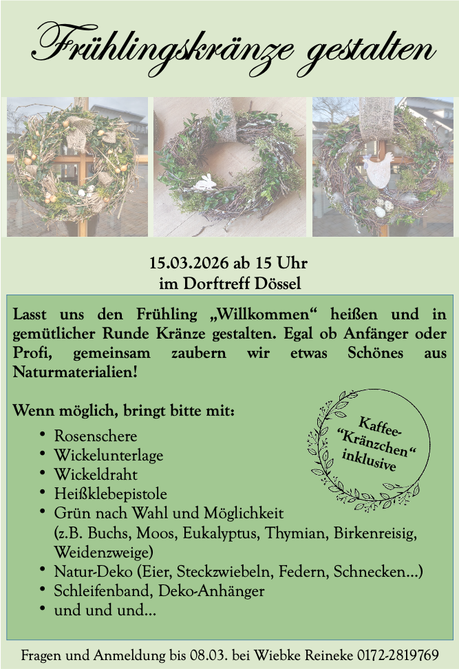 Lasst uns den Frühling „Willkommen“ heißen und in gemütlicher Runde Kränze gestalten.